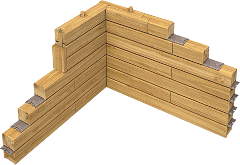 Основание дома (двойная обвязка): брус 100 × 150 мм, 150 × 150 мм, 150 × 200 мм в зависимости от толщины стен. Половые лаги: брус пиленый целиковый 50 × 200 мм, 100 × 150 мм с шагом между ними не более 590 мм. Потолочные перекрытия: доска 40 × 150 мм, 40 × 200 мм с шагом между ними не более 590 мм. Стены дома: профилированный брус (прямой или овал на выбор) 90 × 140 мм, 140 × 140 мм, 140 × 190 мм. Венцы в углах дома собираются в «теплый угол». Сборка сруба на березовый деревянный нагель. Перегородки: профилированный брус (прямой) 90 × 140 мм, 140 × 140 мм, 140 × 190 мм. Сборка на березовый деревянный нагель.